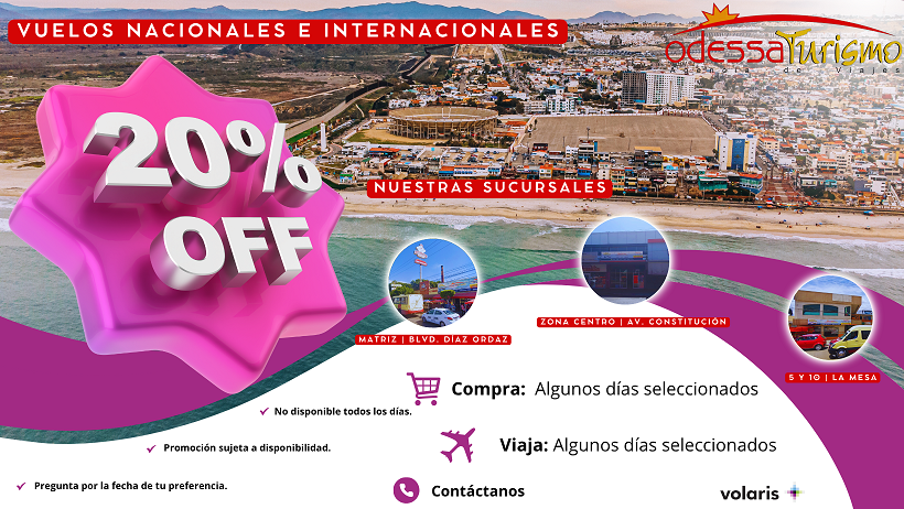 Aprovecha 20% de descuento en viajes nacionales e internacionales, válido solo sobre la tarifa aérea y sujeto a disponibilidad.