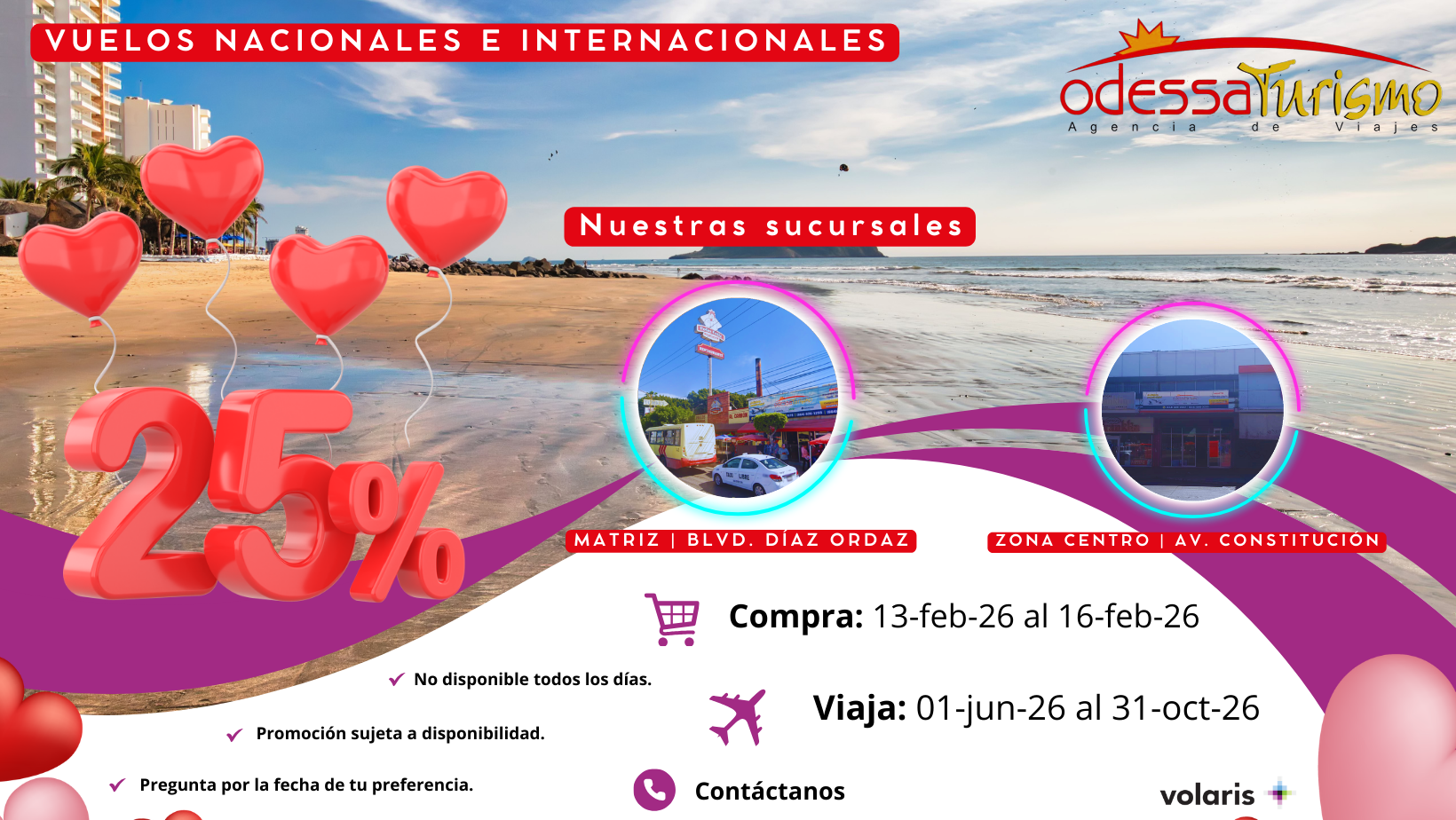 Aprovecha 25% de descuento en viajes nacionales e internacionales, válido solo sobre la tarifa aérea y sujeto a disponibilidad.